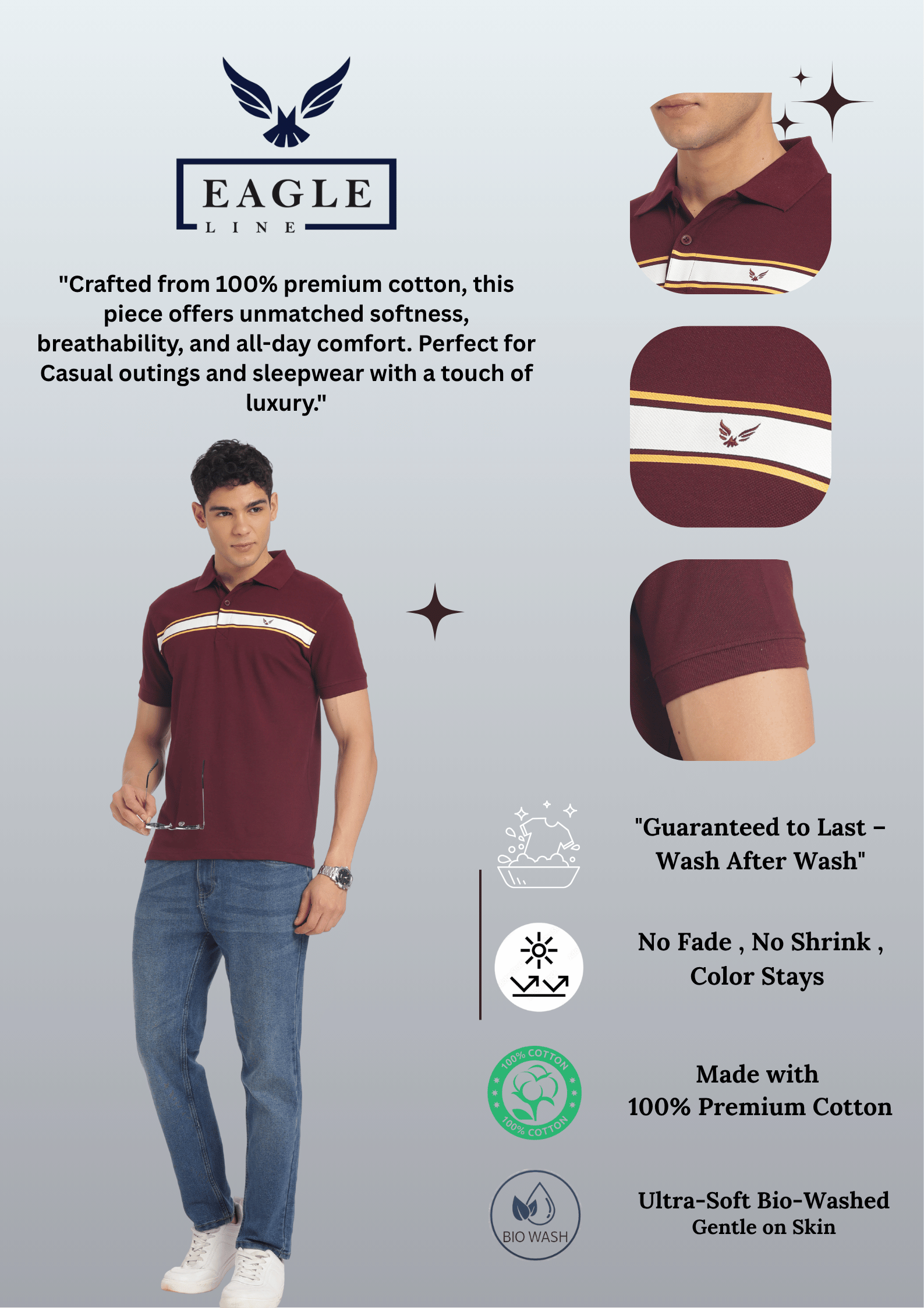 Add a touch of sophistication to your casual wardrobe with this maroon polo T-shirt made from premium 100% cotton fabric. Designed for comfort and style, it features a white and yellow contrast stripe across the chest with a minimal logo detail for a refined look. Perfect for both casual outings and semi-formal occasions, this polo offers breathable comfort and timeless appeal.