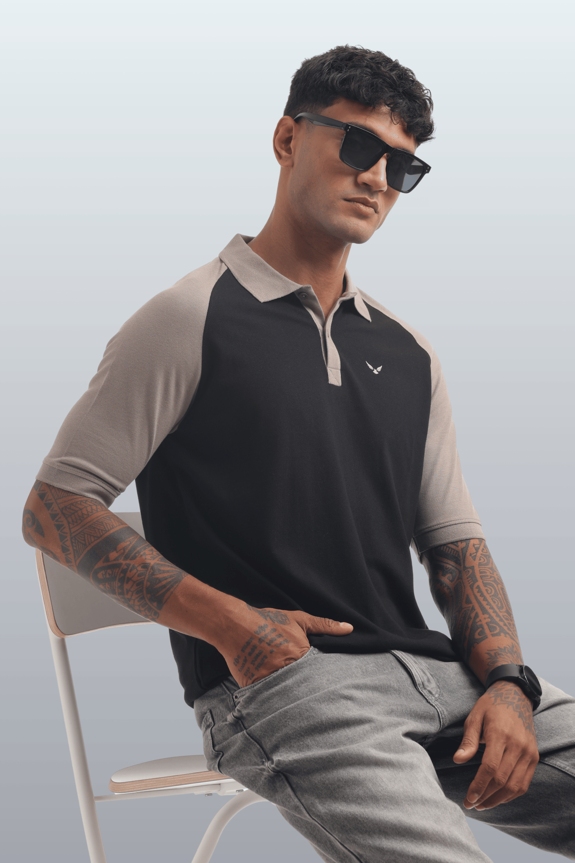 Upgrade your casual look with this stylish Men’s Polo T-Shirt, crafted from 100% pure cotton for unbeatable comfort and breathability. Featuring a black front with contrast beige sleeves and collar, this polo offers a modern twist to a classic design.
